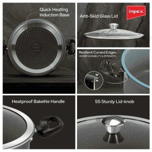 he Impex Biryani Pot 10 Ltr With RIB (IBP10) is designed for large-scale cooking with its premium aluminium construction and high-grade 5-layer super granite coating. This 10-litre pot ensures quick and even heat distribution, making it ideal for cooking large batches of biryani or other traditional meals. Its eco-friendly, PFOA-free coating offers healthier cooking with minimal oil. The pot is induction-friendly, suitable for all cooktops, and features heat-proof bakelite handles along with a heat-resistant exterior. The non-stick surface ensures easy food release and hassle-free cleaning, and it is dishwasher safe for convenience.